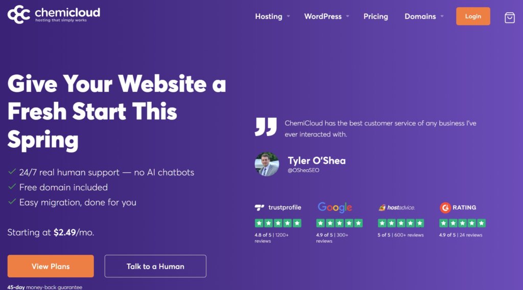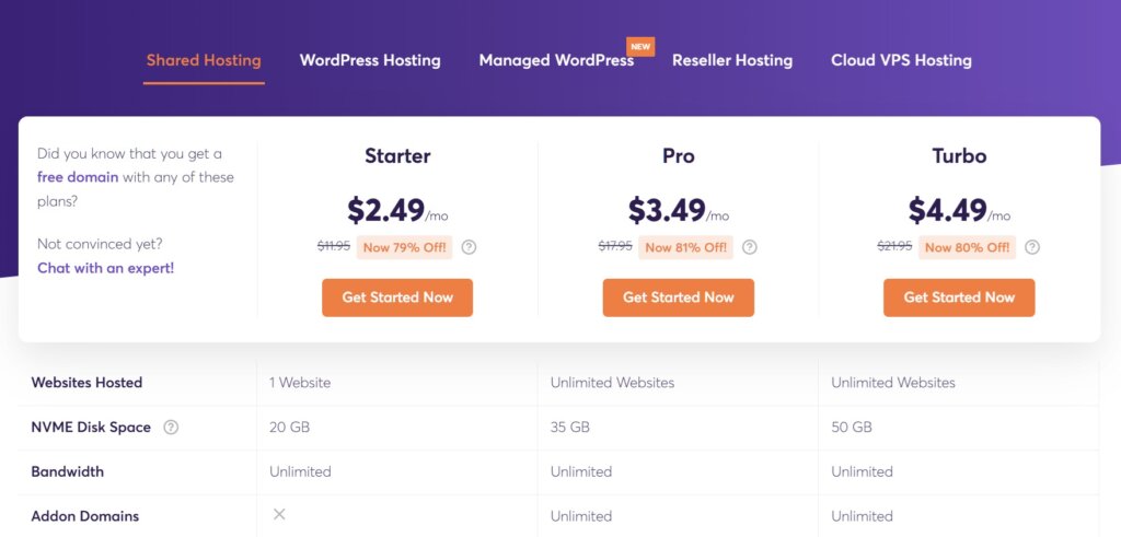 ChemiCloud hosts more than 150k websites worldwide with good customer service & offers specialized hosting for small businesses. ChemiCloud deals in shared hosting, WordPress hosting reseller hosting., and VPS hosting. You will get all the necessary and great WordPress and eCommerce features. All hosting plans include limited web space and unlimited bandwidth and unlimited email accounts too. With the Starter Plan, you can only have a single domain name, but if you go with the Pro Plan, you will get unlimited domains too. When you use our ChemiCloud discount code, you will get the Starter Plan at $2.49/month (free domain included).