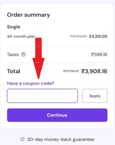 - The next step is to apply the coupon. In the right corner of your screen in the “Subtotal” section, click on “Have a coupon code?“. Enter the code in the promotional box.