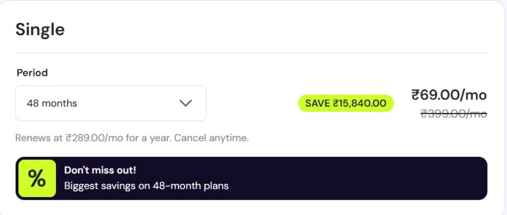 Yes, you can choose month-to-month billing. The monthly billing cost is ₹199 without any discount. Longer billing is recommended. The 85% discount is not valid if you want to pay monthly. We strongly recommend choosing the 48-month hosting subscription if possible.