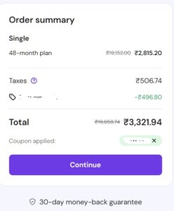 - 83% discount is already added by default. When you apply our exclusive Hostinger coupon, you get an additional 15% discount. That means you are getting an extra ₹496 in savings on your cart. Now the net payable amount is ₹3,321.