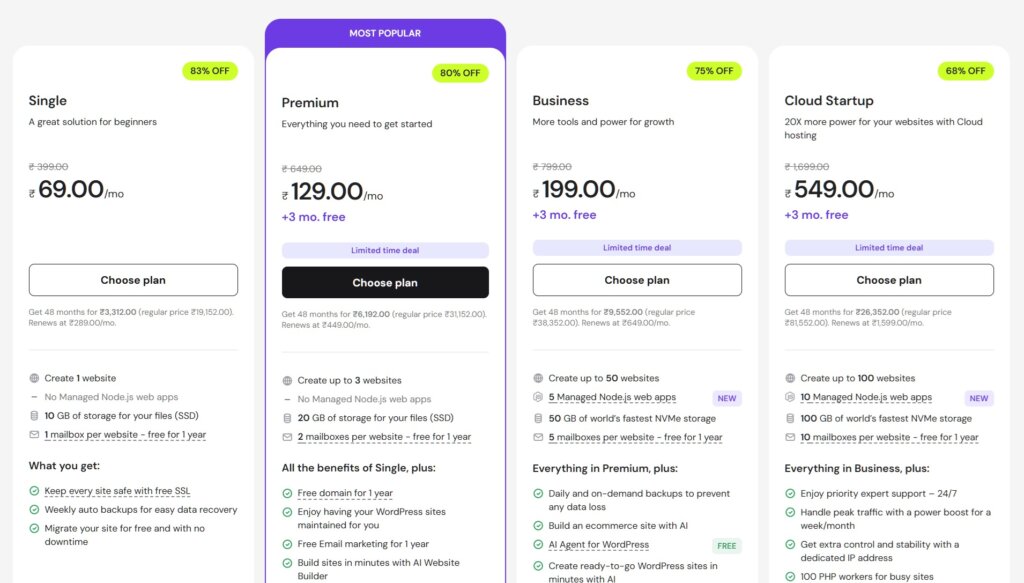Renewal prices are higher than initial prices. According to the official site, the Single plans renew for ₹179 ($2.99), the Premium web hosting plan renews for ₹249 ($5.99), and the Business plan renewal costs ₹499 ($8.99).